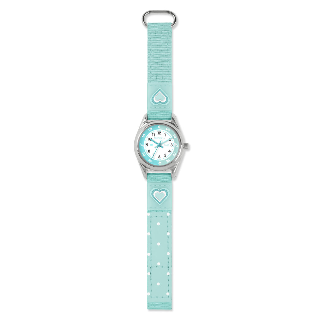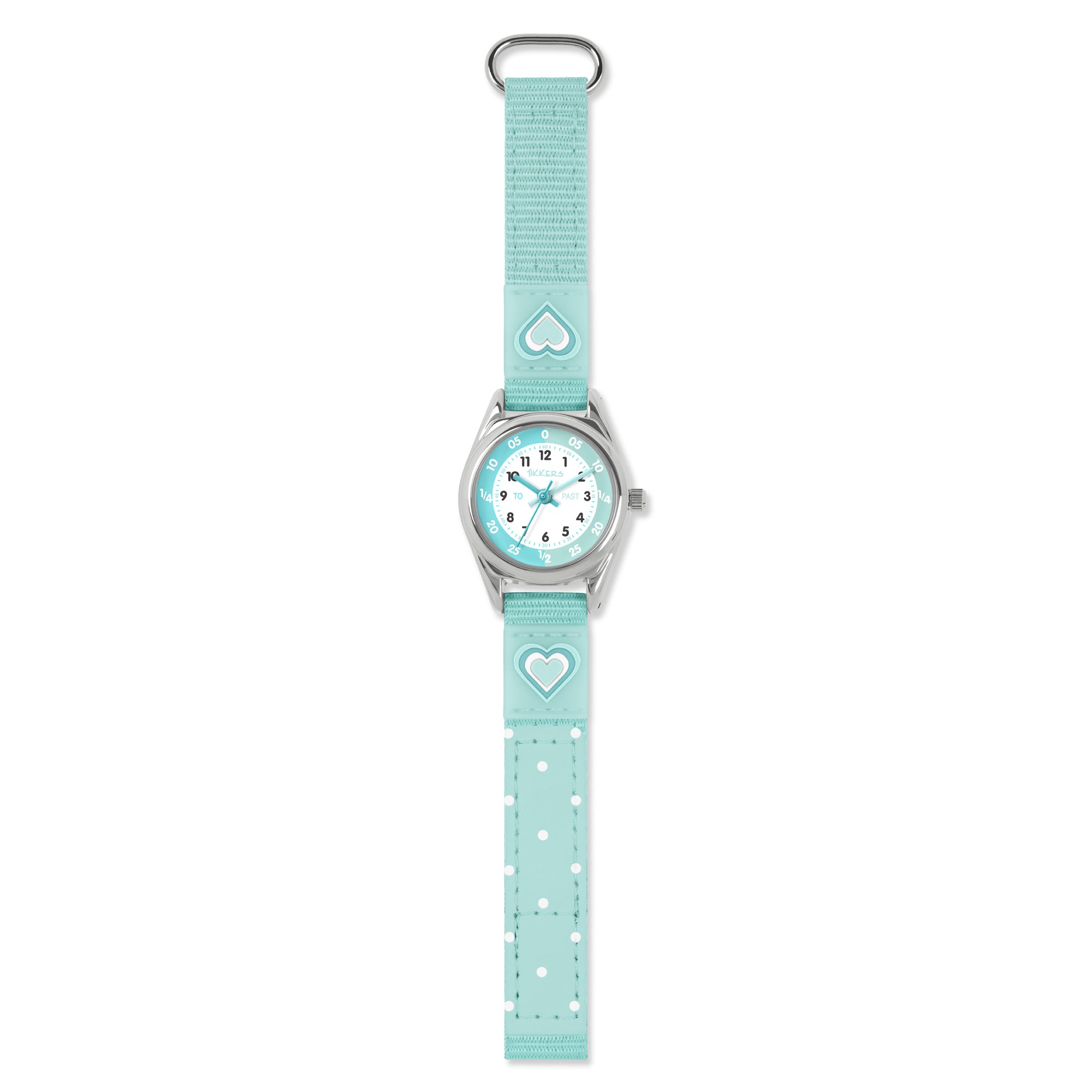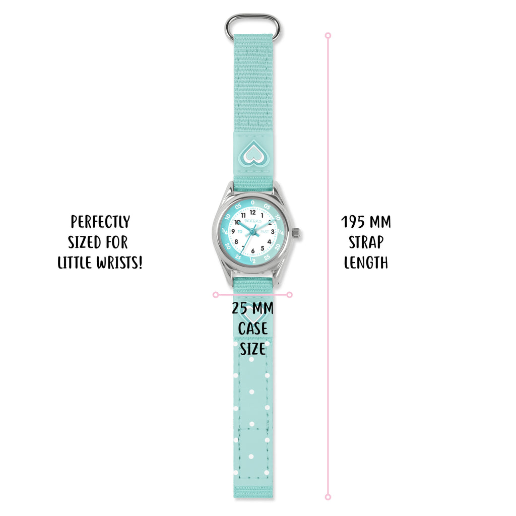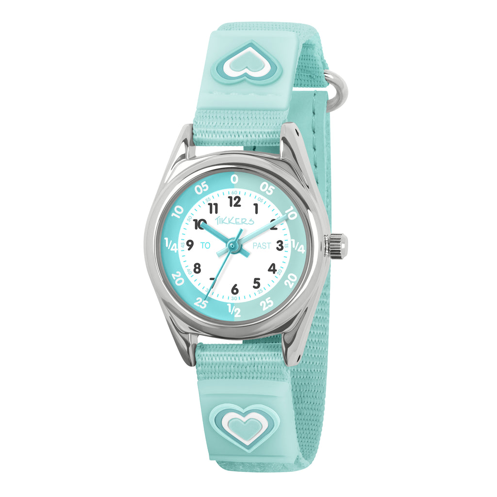 Make learning to tell the time fun with this Aqua Heart Tikkers kids watch. Featuring a soft printed PU aqua strap with colourful silicone hearts and an easy-to-read Time Teacher dial, it’s perfect for little learners. The Velcro fastening ensures a secure, comfy fit, while the silver case adds a stylish touch. Presented in a pretty Tikkers gift box, this set also includes glittery, heart-shaped hair clips— making it a lovely gift for any girls starting their time-telling journey. Includes a one-year guarantee for peace of mind.