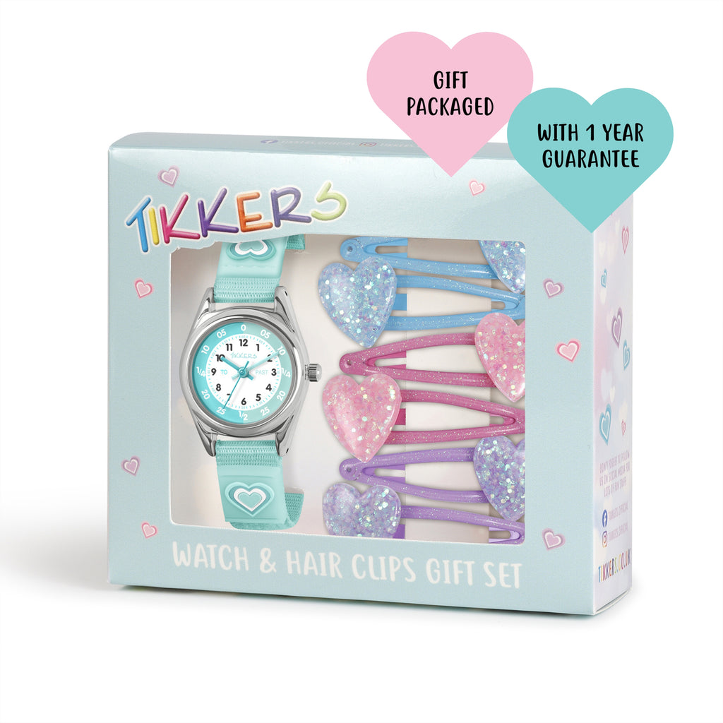 Tikkers Aqua Heart Strap Time Teacher Watch & Hairclip Set ATK1094-SET