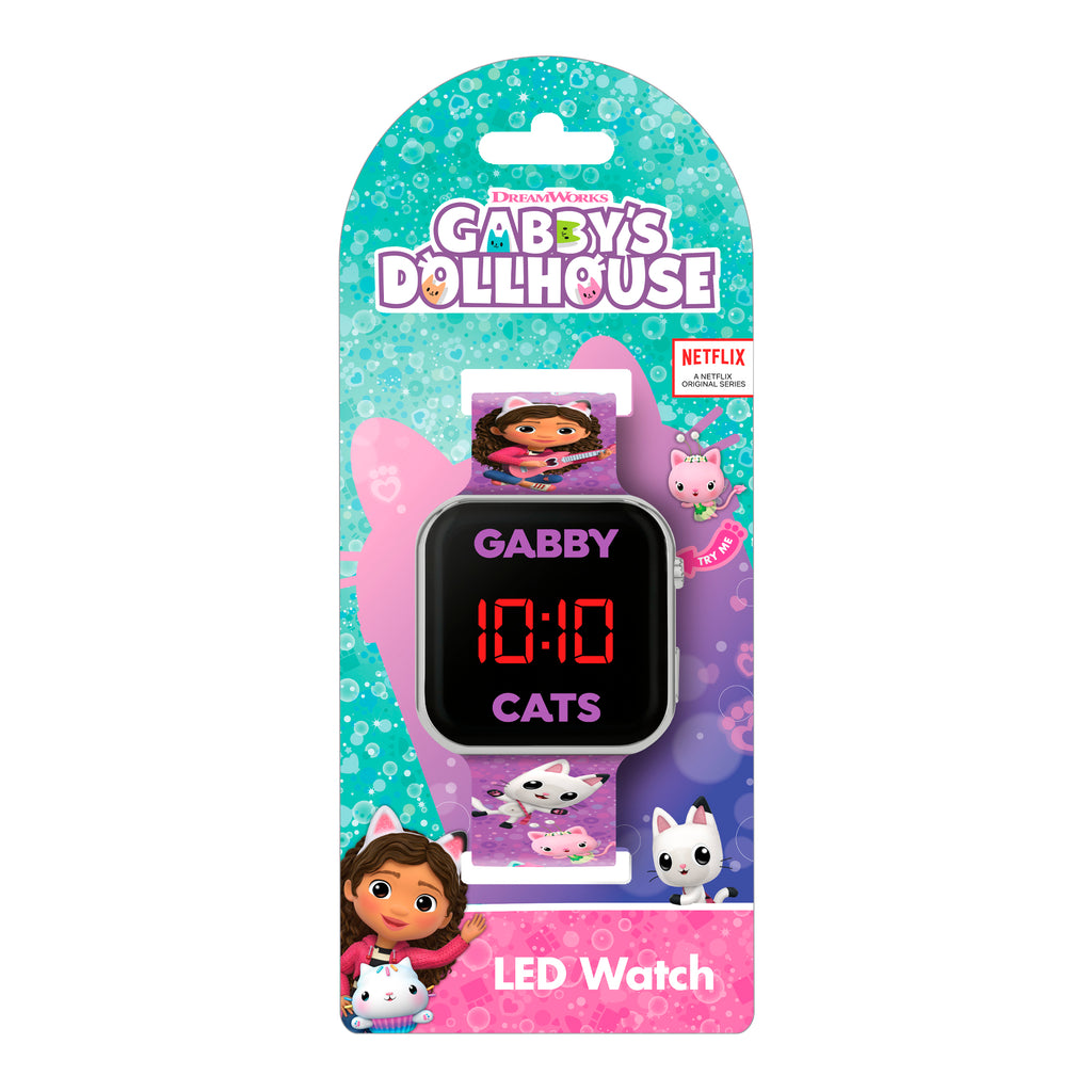 Gabby's Dollhouse LED watch with printed character strap, silver plastic casing, red digital light up display, date feature and fun printed strap design with traditional buckle fastening. Packaged in official branded packaging and comes with one year guarantee.