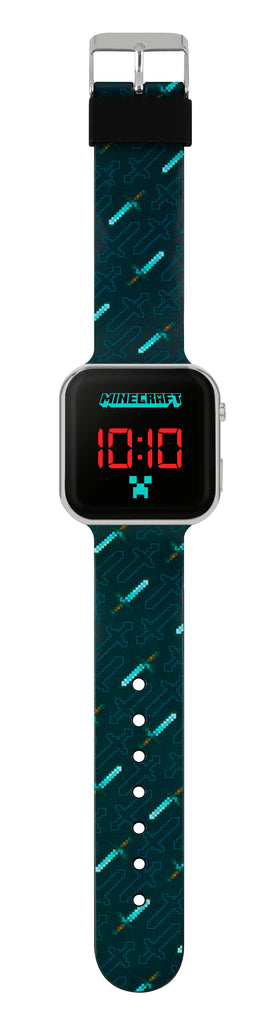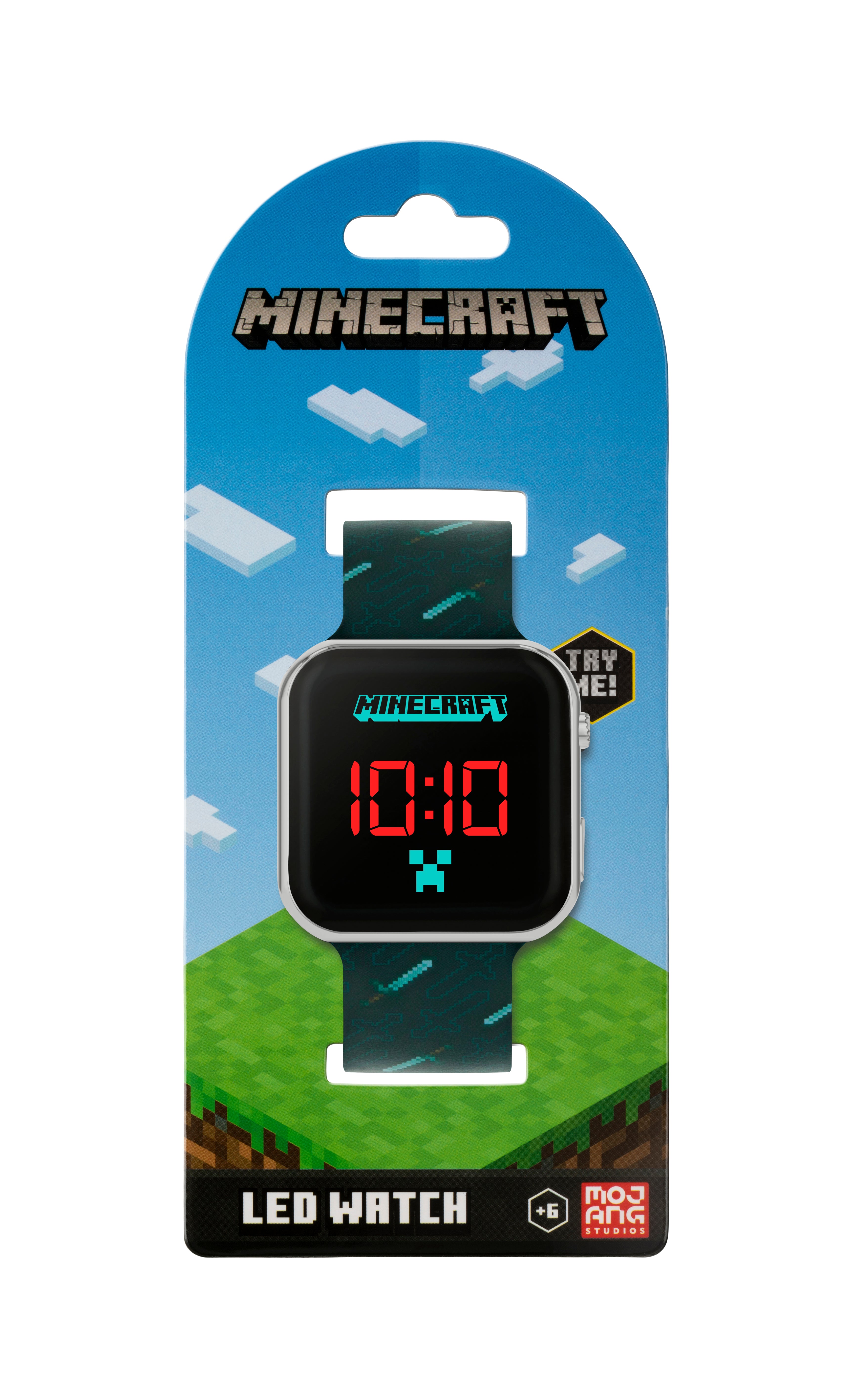 Minecraft LED watch with Minecraft dial design , silver plastic casing, red digital light up display, date feature and fun printed strap design with traditional buckle fastening. Packaged in official branded packaging and comes with one year guarantee.