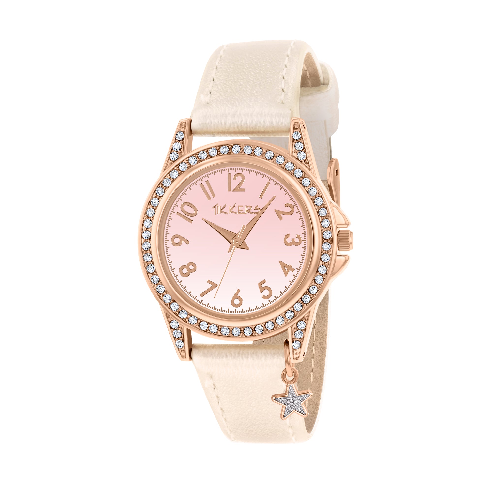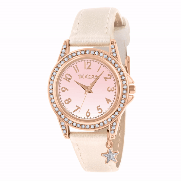 Features Pink Satin Dial, clear stone bezel, buckle strap design, complimented by a hanging sparkly star charm.