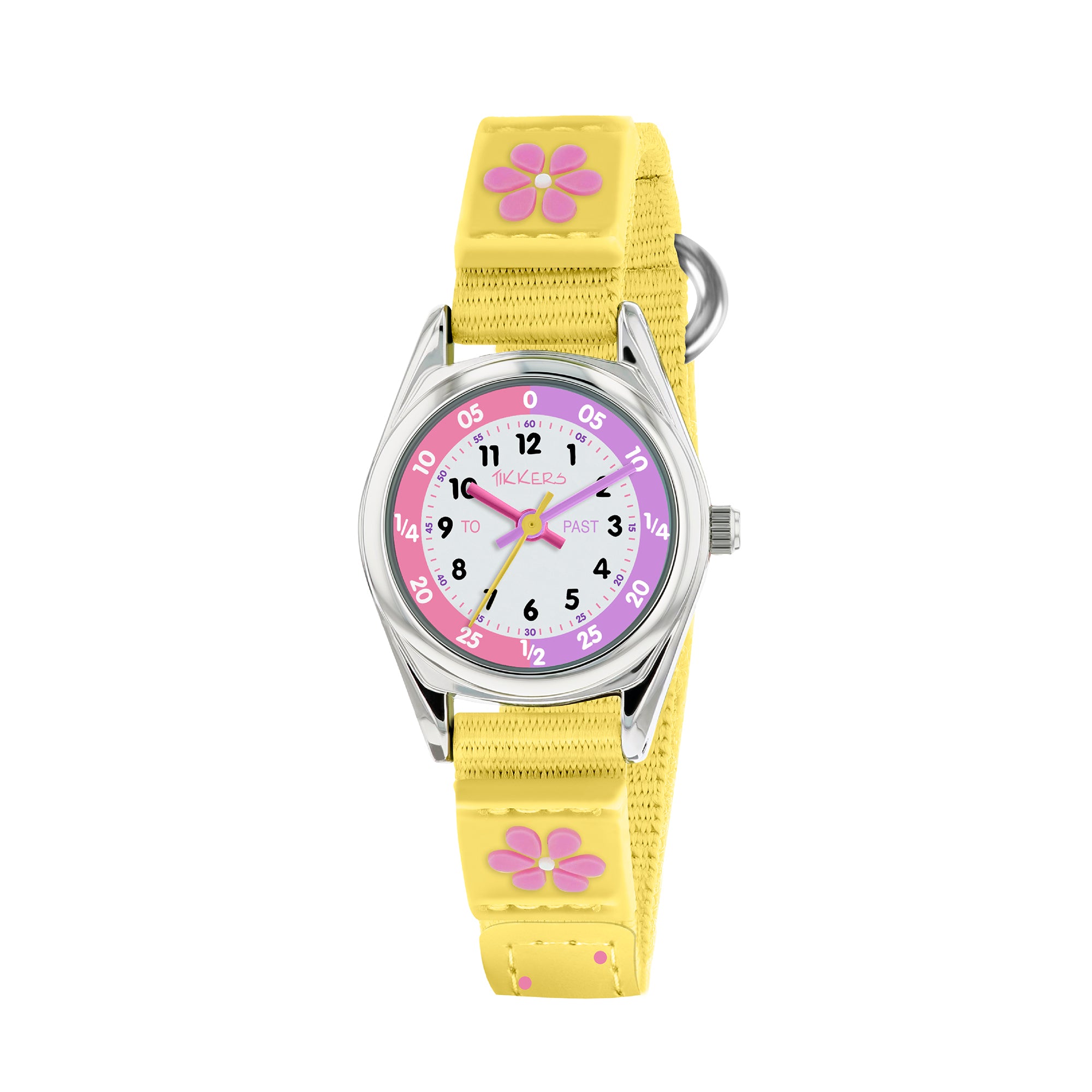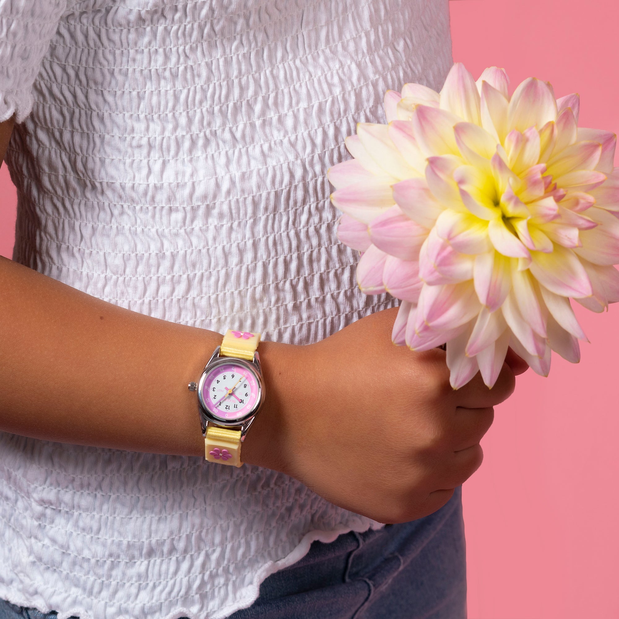 One of our most popular time teachers, this style features an easy read dial with markings specially designed to help kids tell the time with confidence. The strap is made from soft canvas with 3D flower detail and a self-fastening hook and loop closure which is easy for little ones to take on and off themselves. The dinky 25mm case makes this the perfect for younger children.