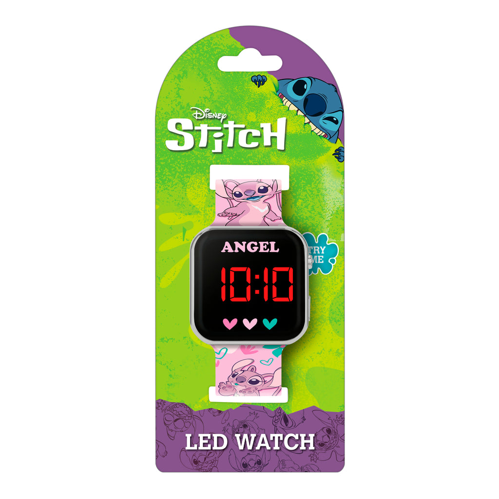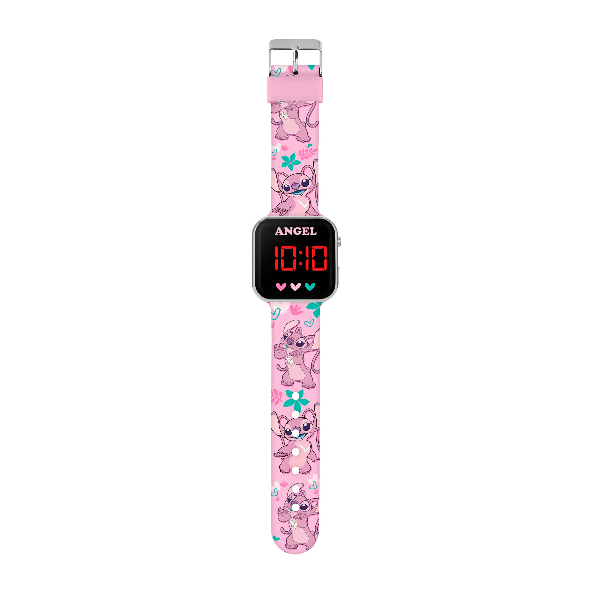 Lilo and Stitch LED watch with digital time design, silver plastic casing, digital light up LED display and fun printed strap design with traditional buckle fastening.