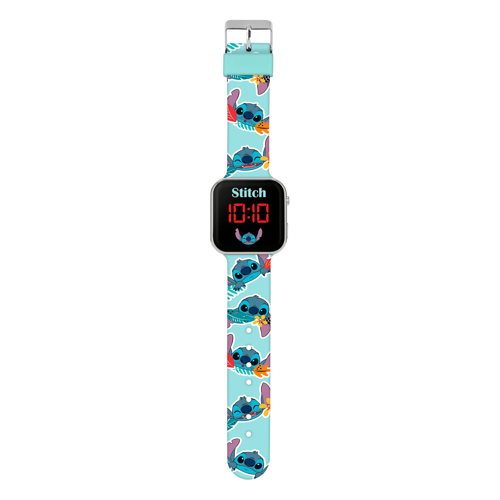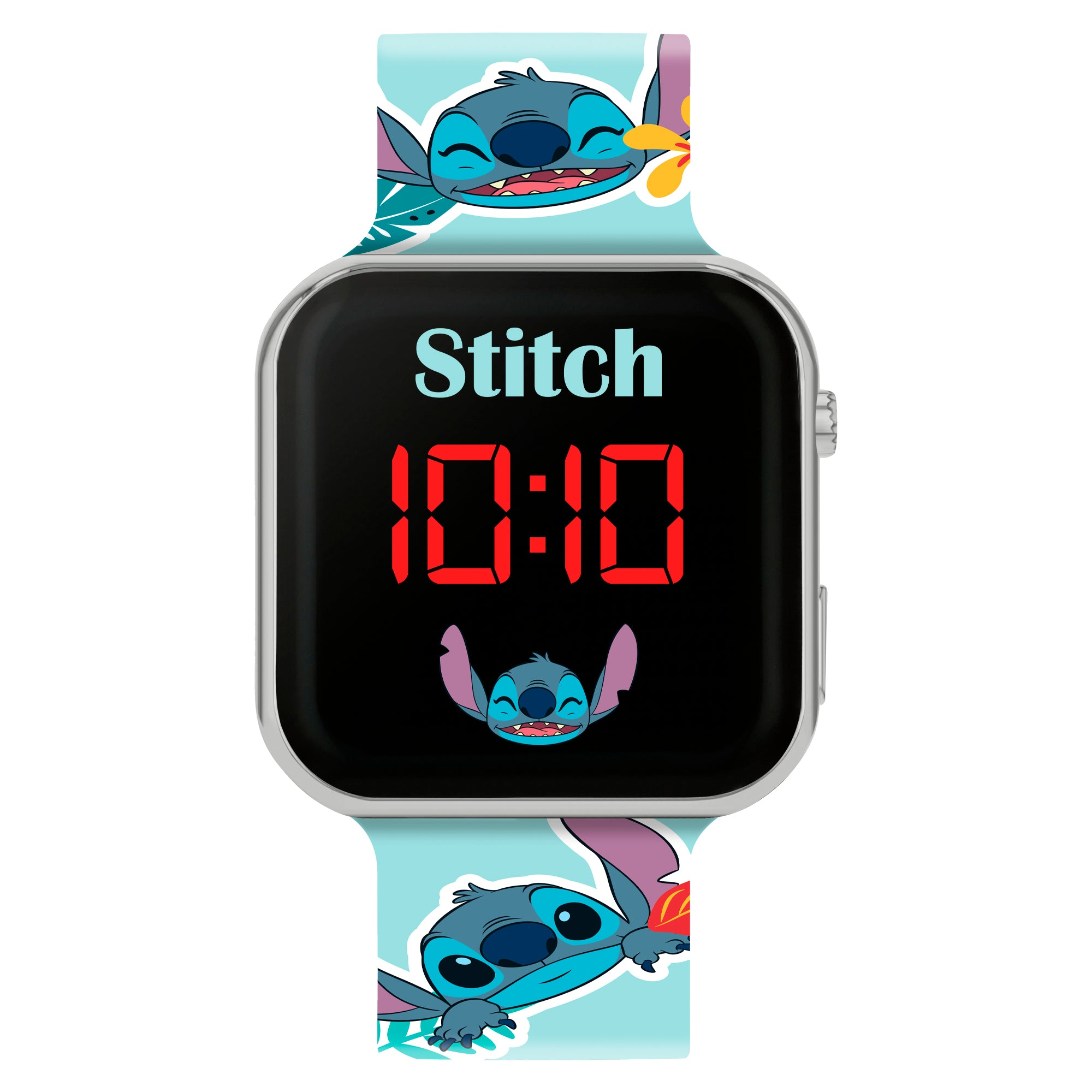 Lilo & Stitch LED Watch featuring a Stitch dial design, silver plastic casing, digital light up display and fun printed strap design with traditional buckle fastening. Packaged in official branded packaging and comes with one year guarantee.