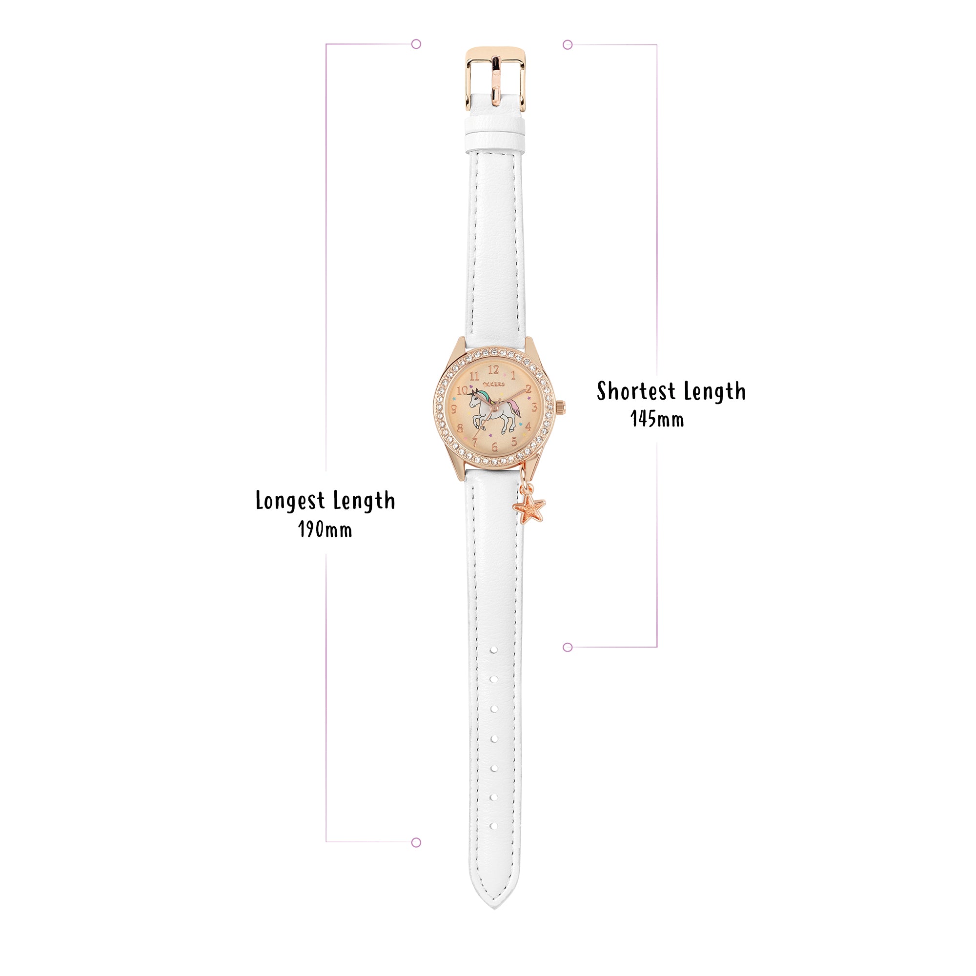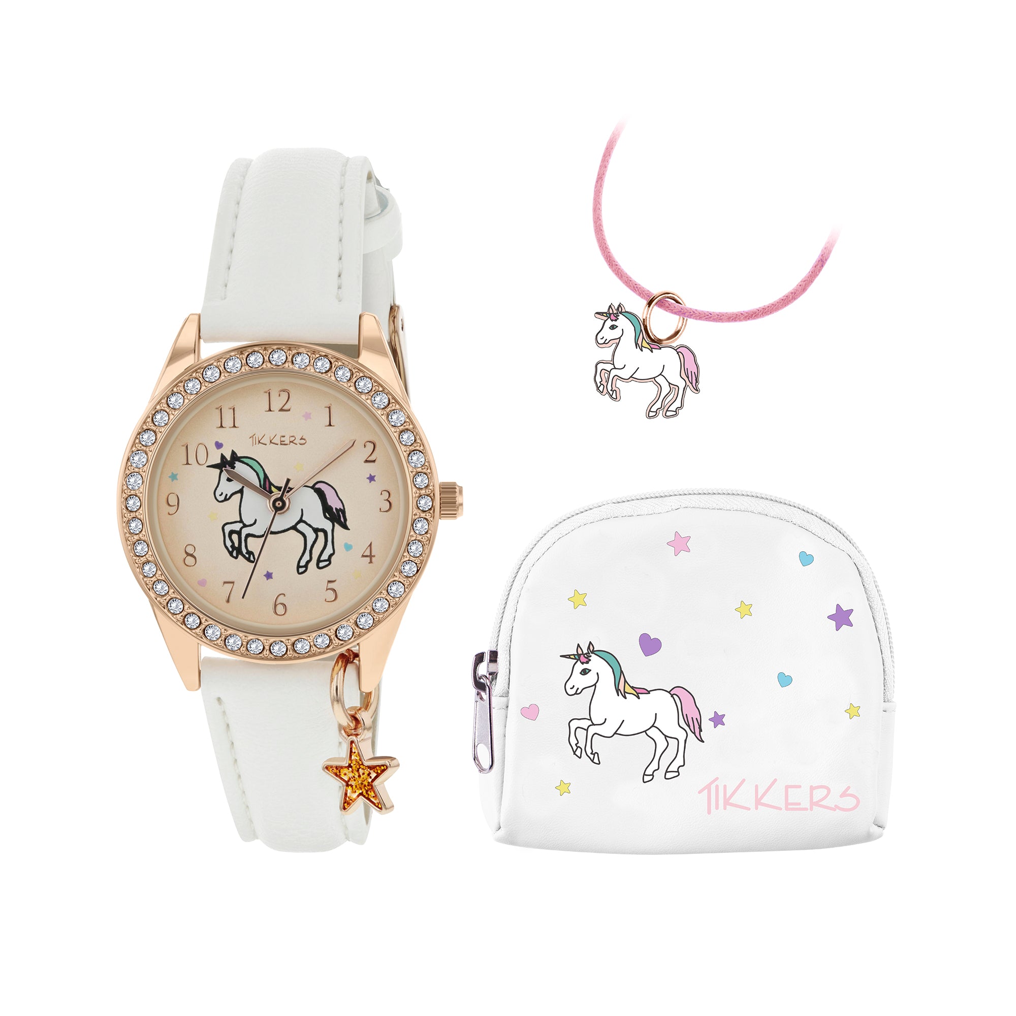 Our magical unicorn gift set contains a super sparkly rose gold tone watch with stone set bezel. The dial features a colourful magical unicorn, complimented by a hanging sparkly star charm. The watch has a soft white leatherette strap and rose gold tone buckle.