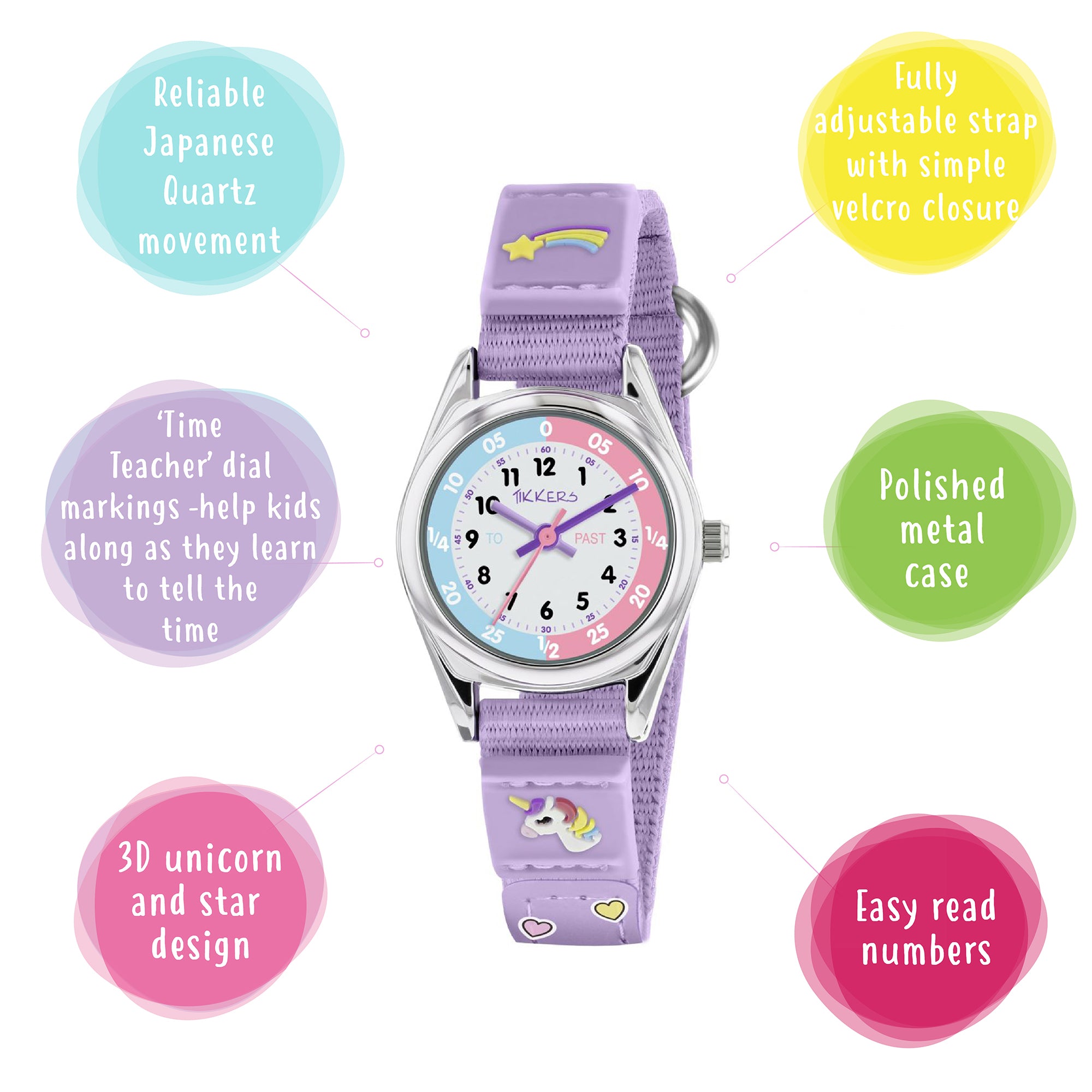 One of our most popular time teachers, this style features an easy read dial with markings specially designed to help kids tell the time with confidence. The strap is made from soft canvas with 3D unicorn & shooting star detail and a self-fastening hook and loop closure which is easy for little ones to take on and off themselves. The dinky 25mm case makes this the perfect for younger children.