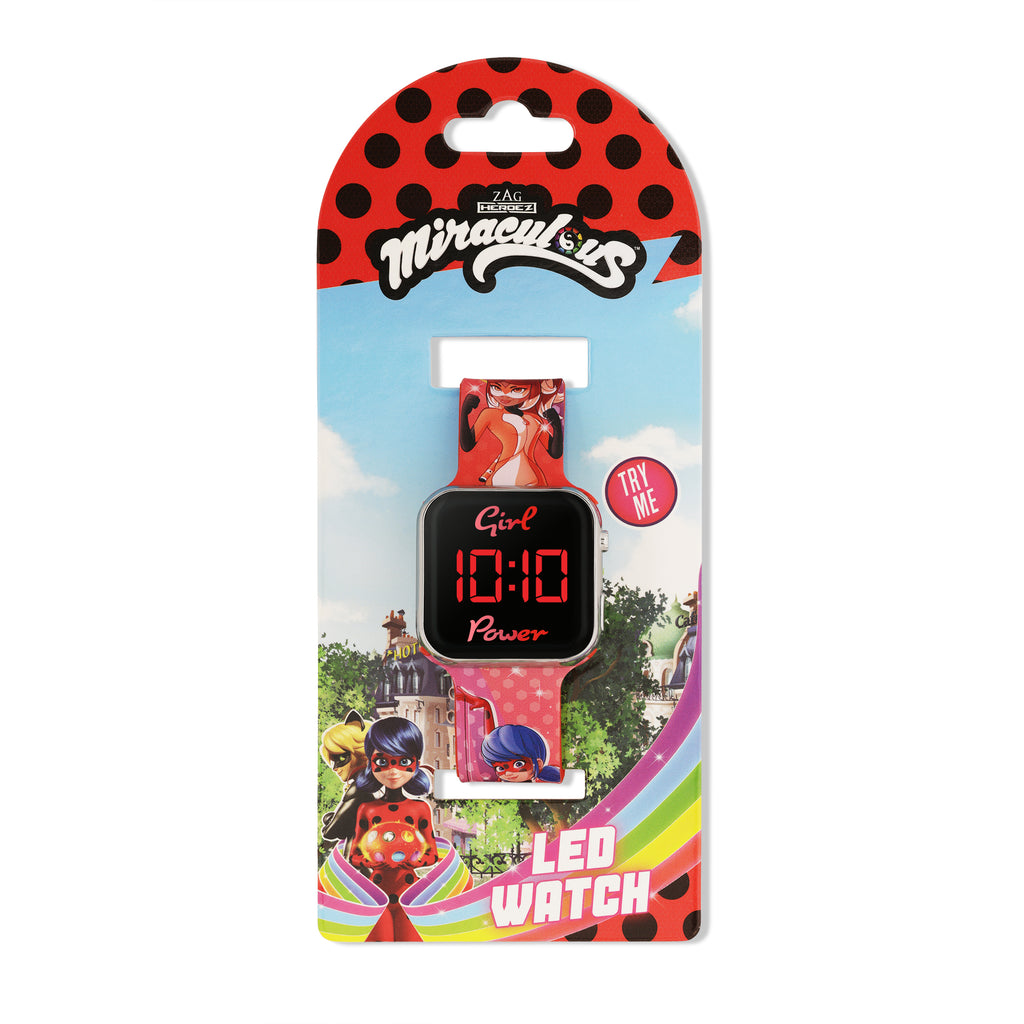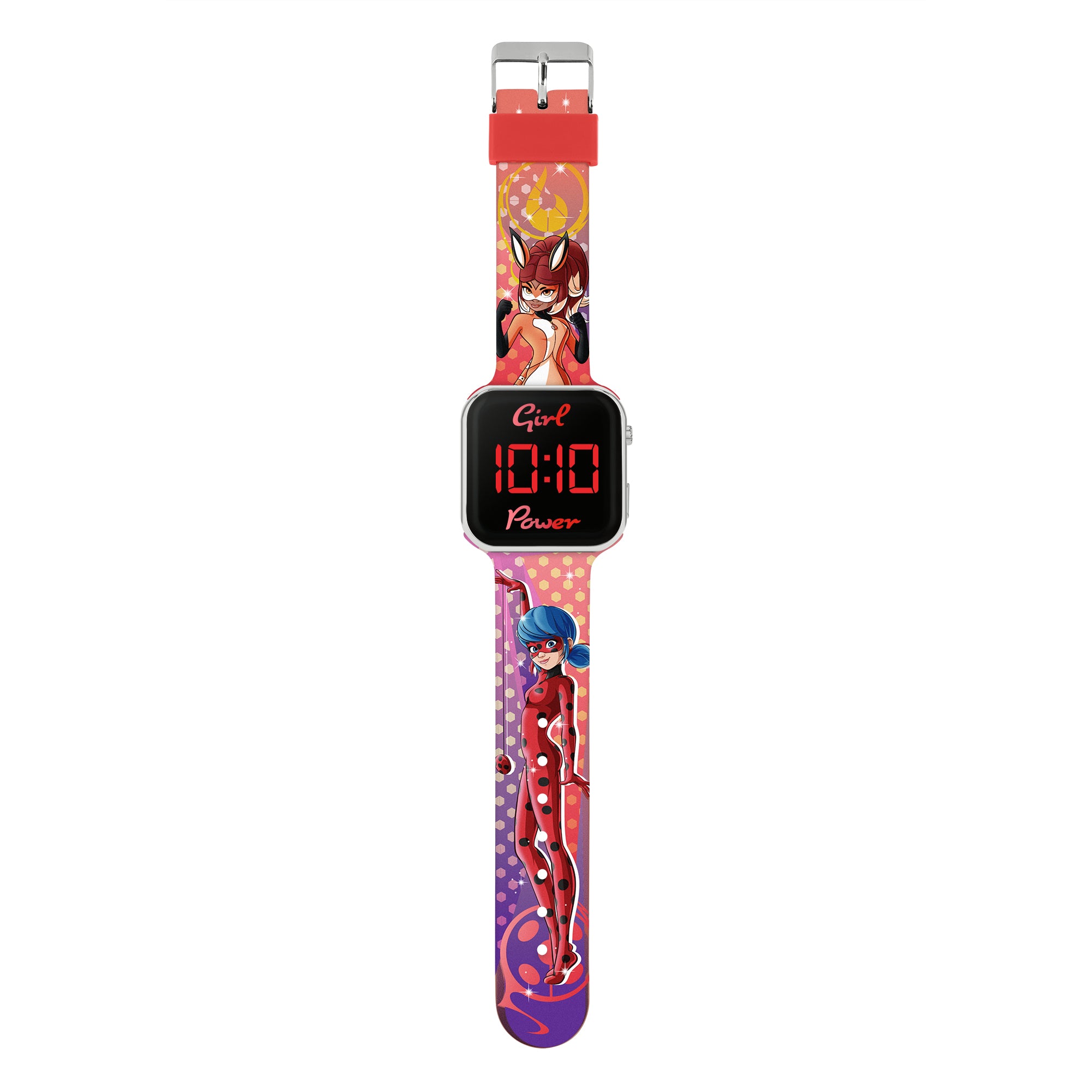 Disney Miraculous Ladybug LED watch with Digital time design, silver plastic casing, red digital light up LED display and fun printed strap design with traditional buckle fastening.