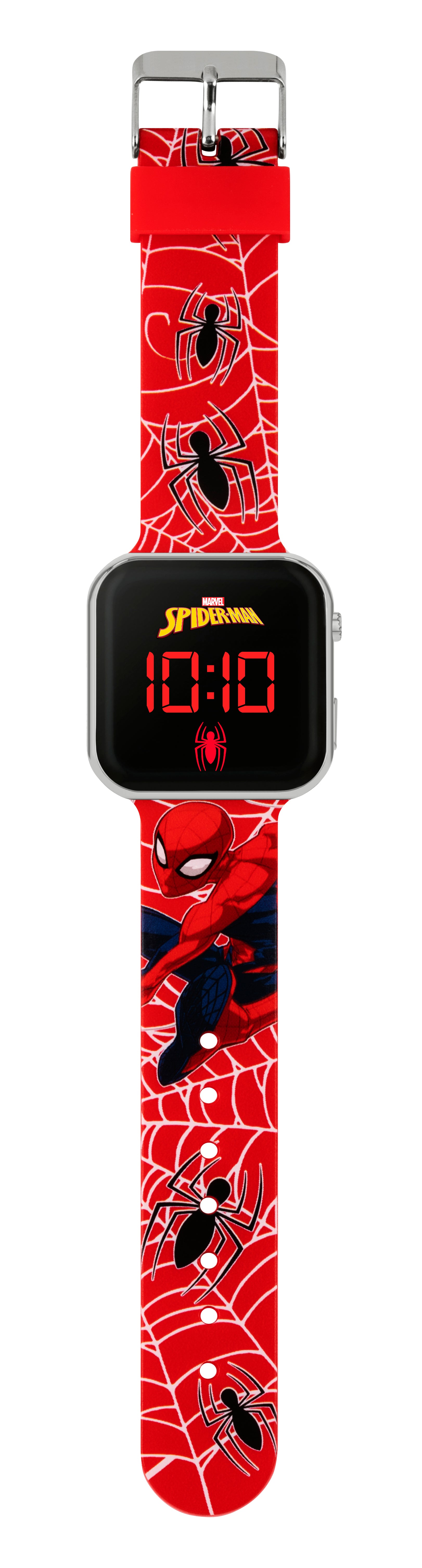 Disney Marvels Spiderman LED watch with Spiderman dial design, silver plastic casing, red digital light up display, date feature and fun printed strap design with traditional buckle fastening.